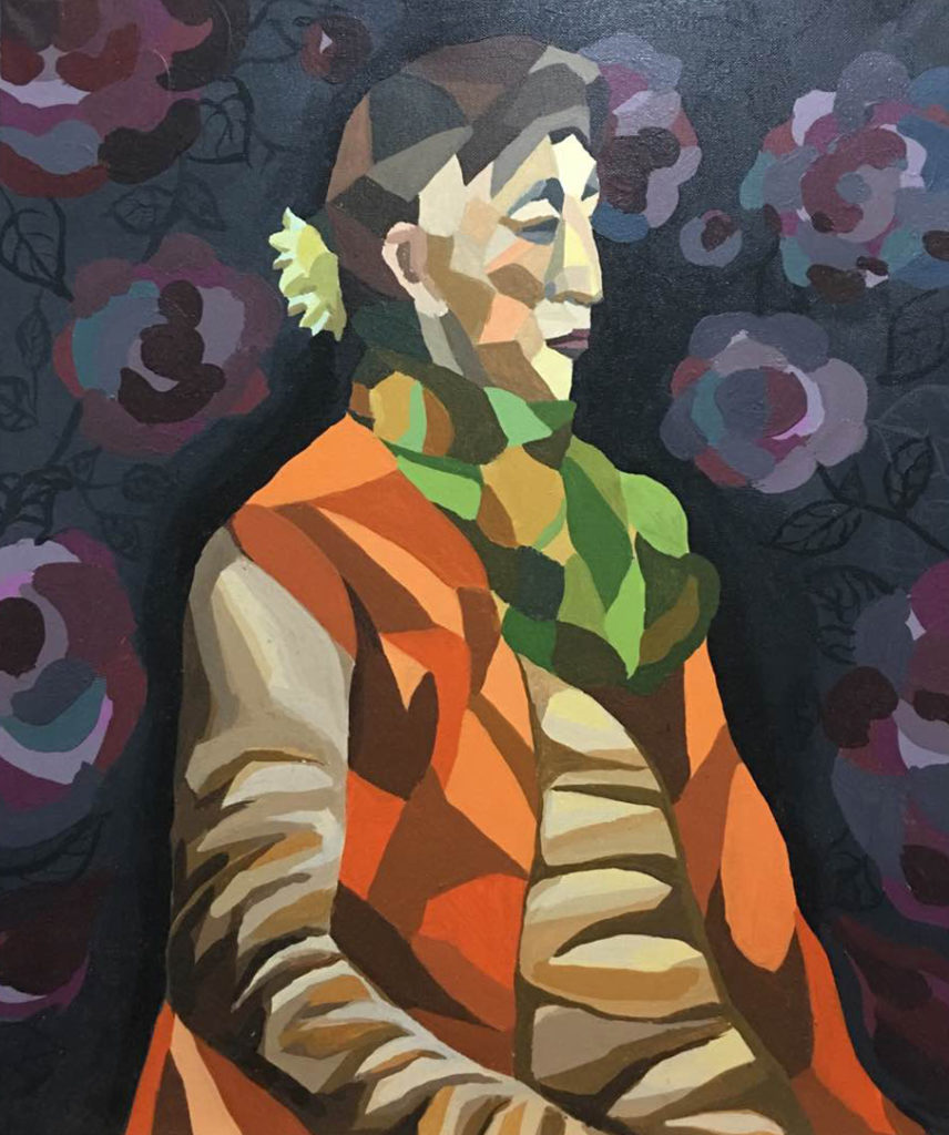 陈瑶《五婶》 《五婶》,布面油画 “五婶”所画的是邻家的五婶,起初对她的这个年龄仍保持苗条的体态所吸引,其次对她的干练、泼辣作风产生浓厚的兴趣……。开始起笔时我想用这种近似于图案的色块形式来突出她的纤瘦的面部棱角,并应用浓厚鲜亮的暖色块来表现肢体和服装,这正好与深暗的冷色背景形成鲜明的对比,彰显主题!并以花为背景和头饰的花相互呼应,体现五婶心中对美的渴求。值得一提的是此画神似“五婶”!
